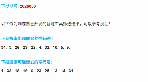 本期分析:本期的冷热分布,本期的遗漏大于9的号码有8个,上期的冷码开出了1个号码,温码开出了3个号码,上期热码开出了1个号码,上期热码开出2个号码,本期的热码可以考虑2到3个号码,冷码考虑1个号码,温码补位1到2个号码。(热码:蝴蝶算法中概率前10的号码,只有10个;冷码:遗漏大于等于9的号码;温码:排除前2类之外的剩下的号码,都是温码;)