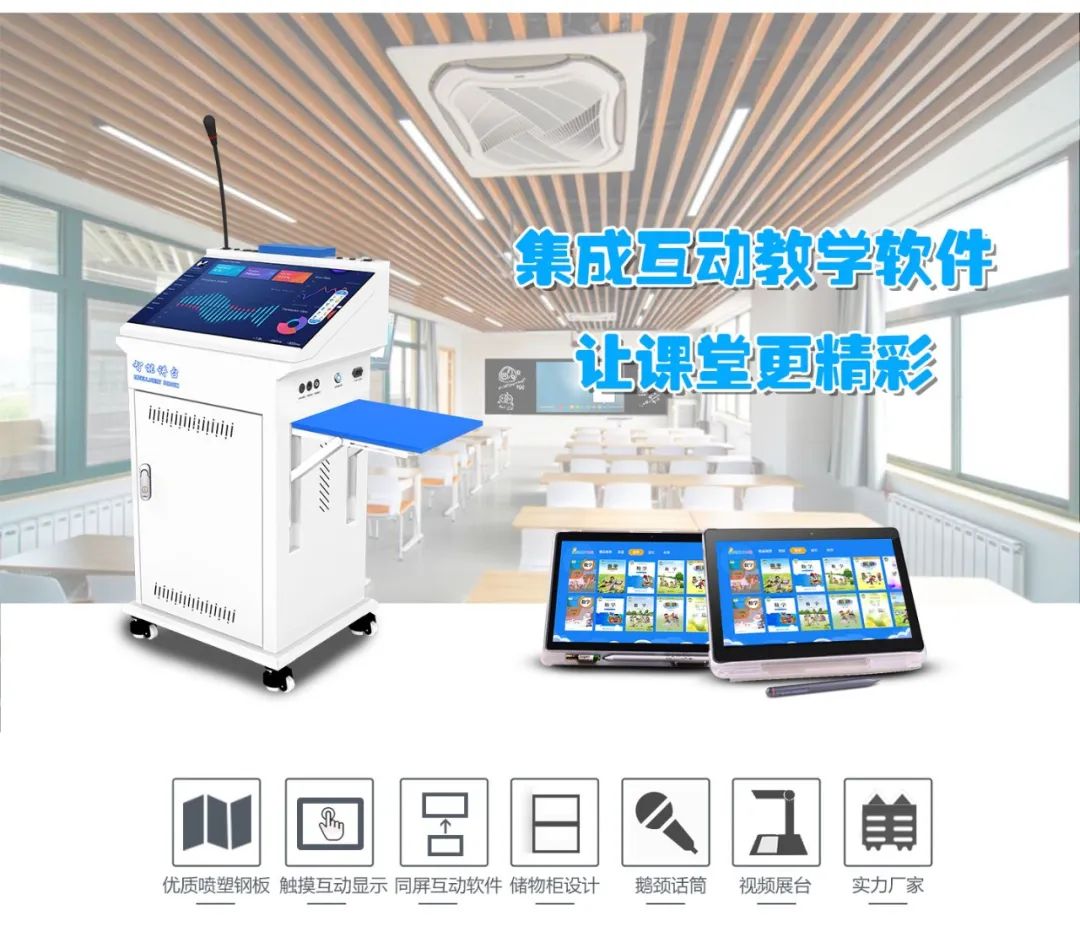 际庆多媒体互动讲台是一种将传统多媒体讲台+触摸式电脑+互动教学软件集合为一体新型产品。整体采用全钢优质材料,静电喷塑处理,集成高性能工控电脑、23.8英寸触摸屏、照明灯、音响、话筒于一体。而且拥有大容量的内部空间、一机多用、还具备多种外置设备接口连接需求(支持定制),使教师在使用过程中操作更简便、更安全。