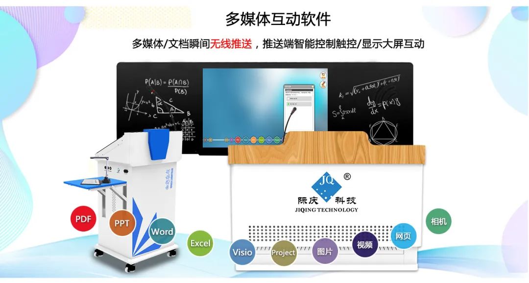 集成多媒体互动软件:无缝衔接讲台、多点触摸屏、互动黑板、投影机、移动终端等等,实现实时同屏和触控批注。支持PPT、WORD、EXCEL、Visio、Project、PDF、高清图片、高清视频、网页9大数据格式文档智能识别,可将这些多媒体自动转化为可互动的多媒体,可自由放大、缩小、平移、旋转和标注多媒体内容,标注结果可回顾浏览,且无需安装第三方软件。