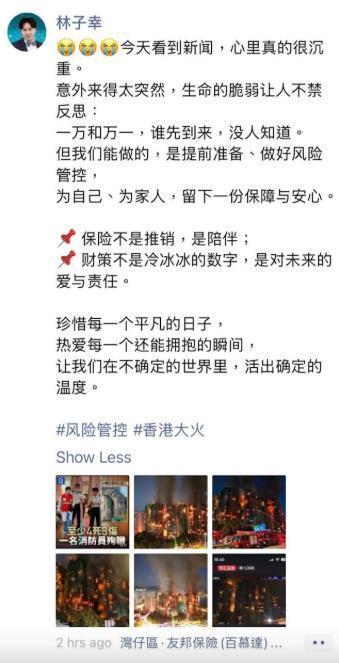 港媒报道,在宏福苑大火正在肆虐之际,特约演员林子幸在微信朋友圈以“意外来得太突然”为题,大谈保险的重要性。