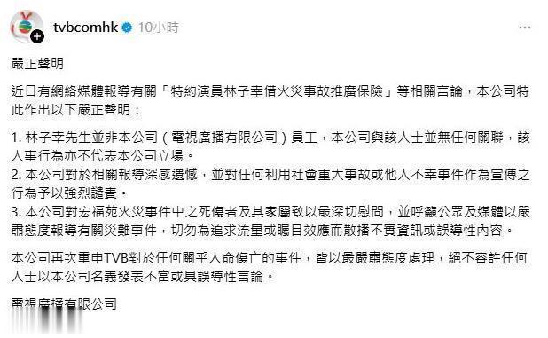 TVB企业传讯部深夜发出严正声明,提到林子幸并非该公司(电视广播有限公司,也即TVB)员工,该公司与该人士并无任何关联,该人事行为亦不代表该公司立场。