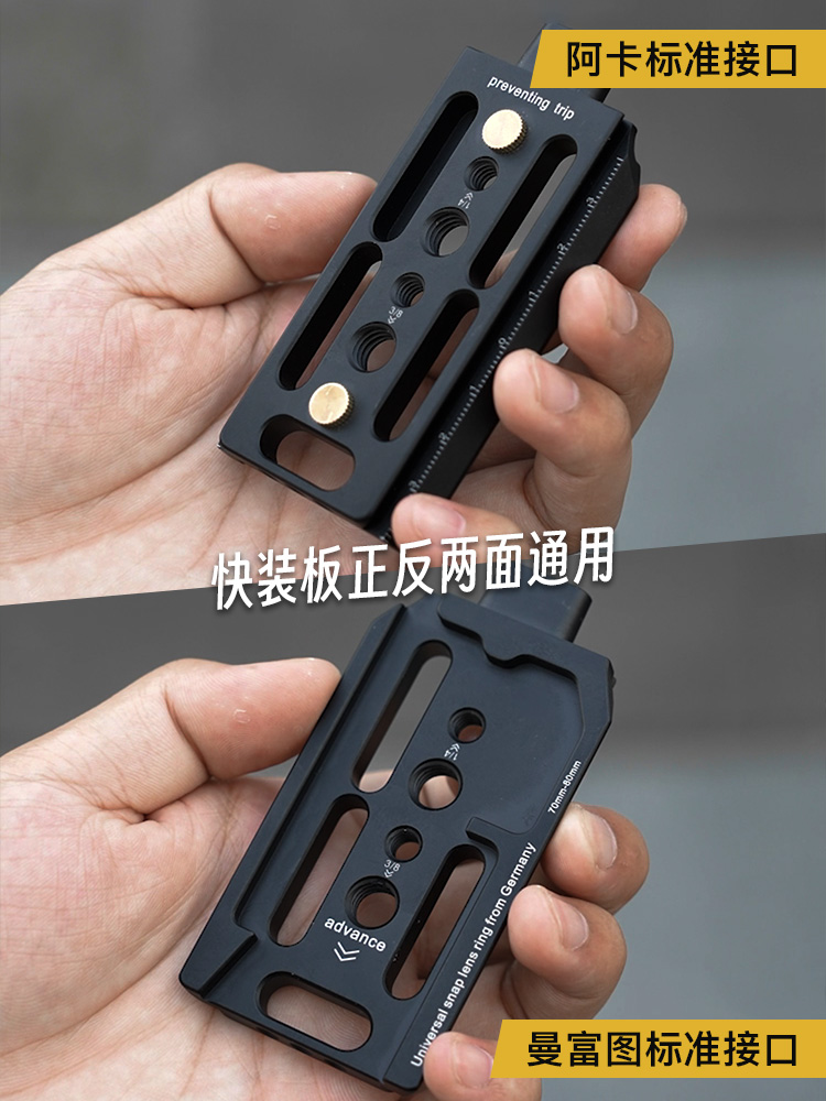 不用换三脚架!快装板自带一面阿卡标准接口、一面曼富图标准接口。