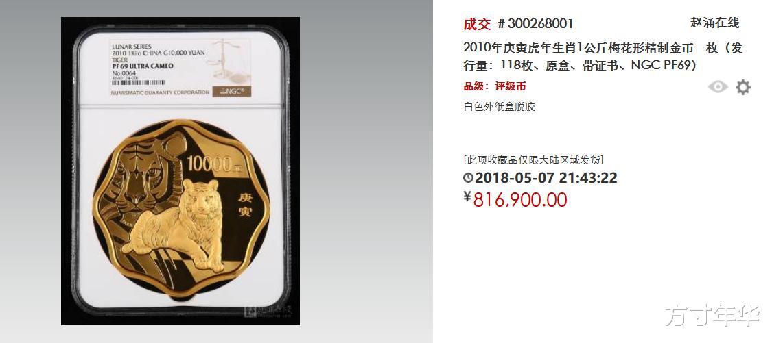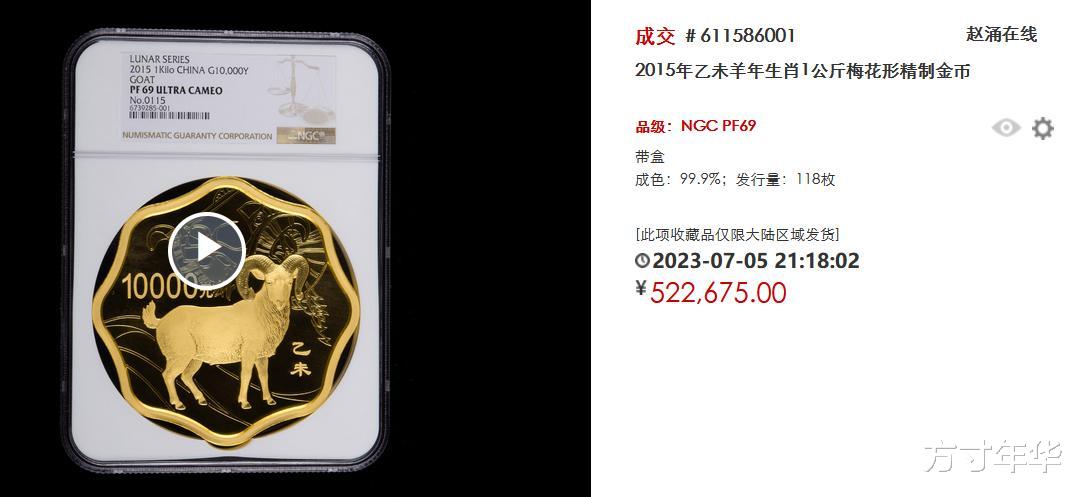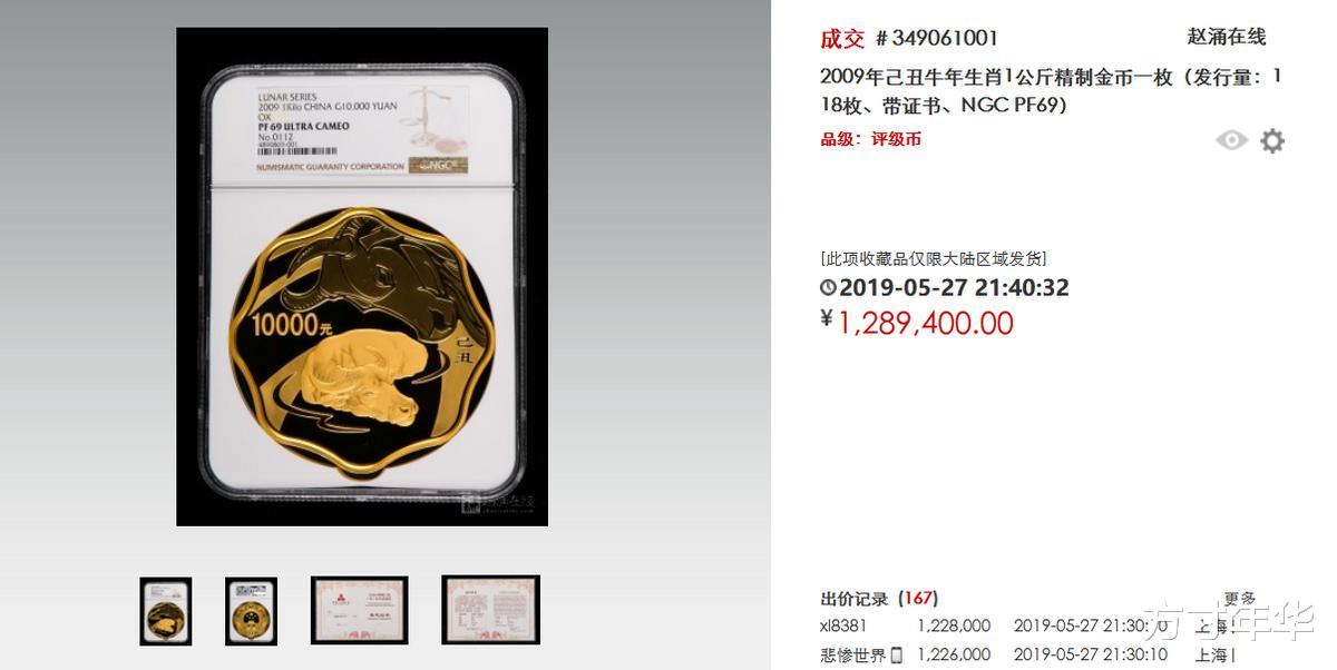 2009年己丑牛年生肖1公斤精制金币,发行量仅118枚,带证书且经NGC PF69评级,最终以1,289,400元成交;2007年丁亥猪年1公斤梅花形精制金币,同样发行量118枚、NGC PF69评级,成交价达1,241,100元。