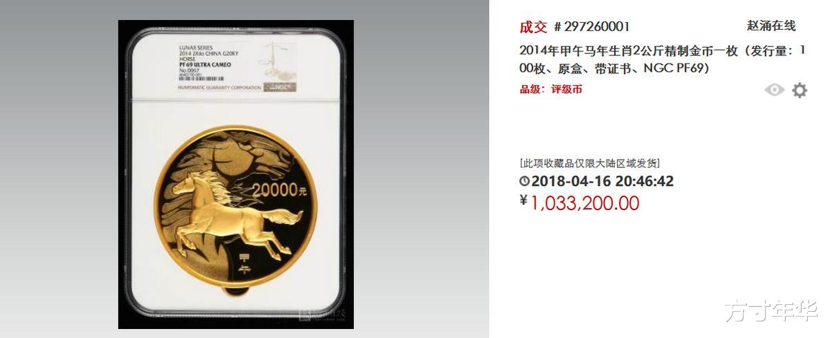 2公斤规格的大克重生肖金币,则更是备受藏家青睐:2014年甲午马年生肖2公斤精制金币发行量100枚,成交价格为1,033,200元;2018年戊戌狗年生肖2公斤精制金币发行量仅50枚,也以945,000元成交。
