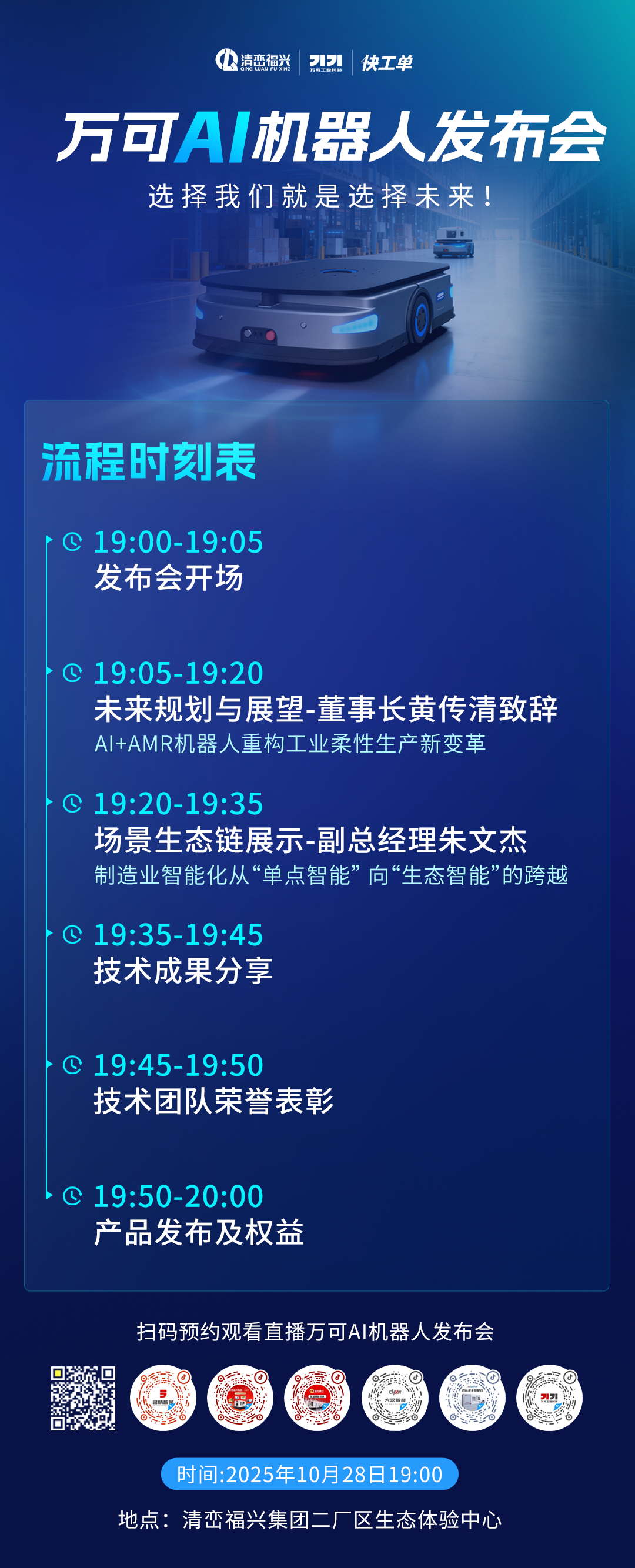 无论你是制造业的生产管理者、仓储物流的运营负责人,还是关注工业智能的行业观察者,10 月 28 日的万可 AI 机器人发布会,都将是你见证 “工业智能未来” 的重要时刻。让我们共同期待,这场发布会如何成为颠覆工业智能的 “未来里程碑”,如何为行业开启 “更智慧、更高效、更普惠” 的新征程!