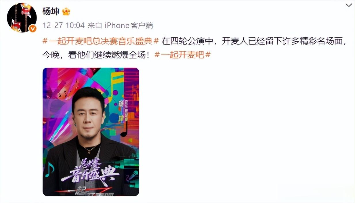 这不最近《一起开麦吧》还在热播呢吗,而杨坤就在里面当着嘉宾,身份是音乐培训师,而27号也是总决赛的开幕。