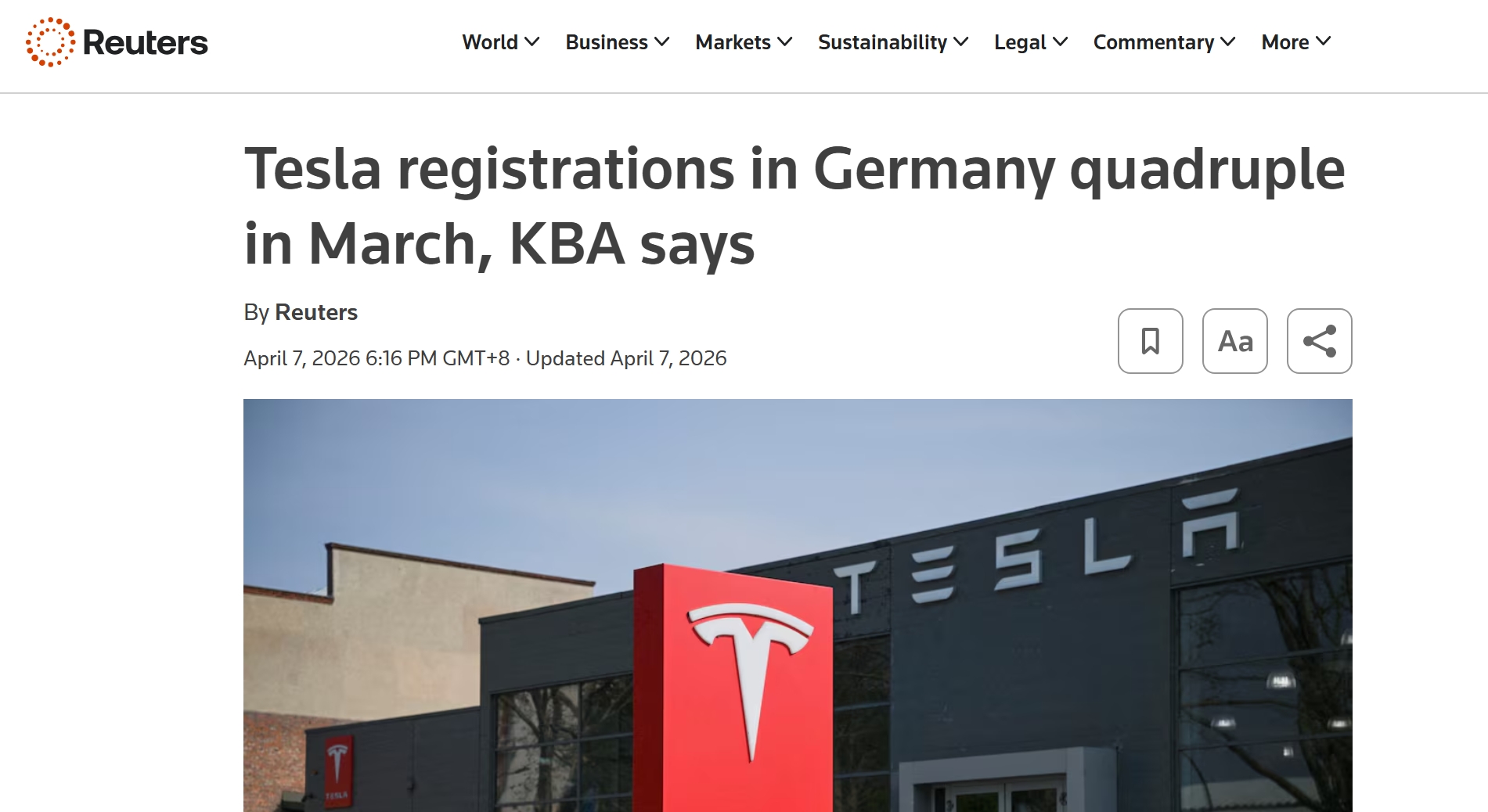 据路透社4月7日的报道,比亚迪三月份在德国市场注册量为3438辆,同比激增327.1%。上汽名爵的表现则依然稳定,月注册量为1万辆左右,其中MG4 EV依然为德国销量最高的新能源车型之一。