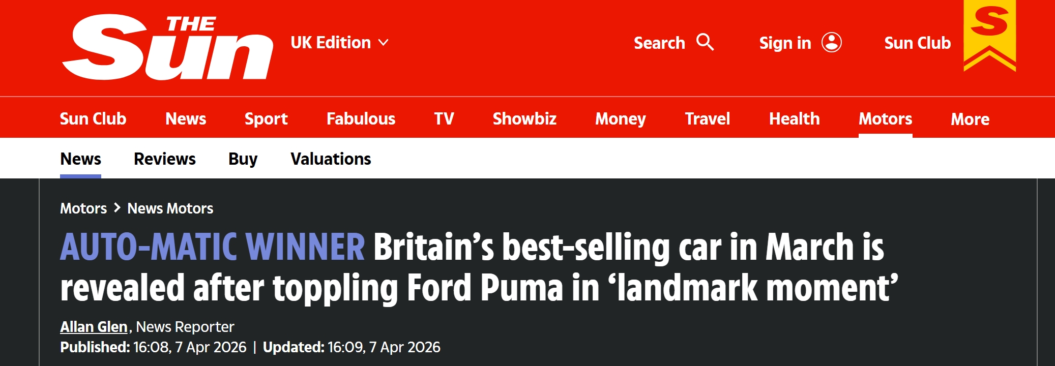 据英国《太阳报》4月7日的报道,“一款去年才向英国人销售的中国汽车,已成为英国最畅销的车型。它在三月凭借销量超过福特、日产和起亚的热门车型,夺得冠军(原文如此)”。而这款车正是奇瑞汽车的“Jaecoo 7(国内称探索06)”,其在三月份的注册量达到10064。通过这款车型的销量火爆,奇瑞三月份在英国的汽车销量达到1.8万辆。