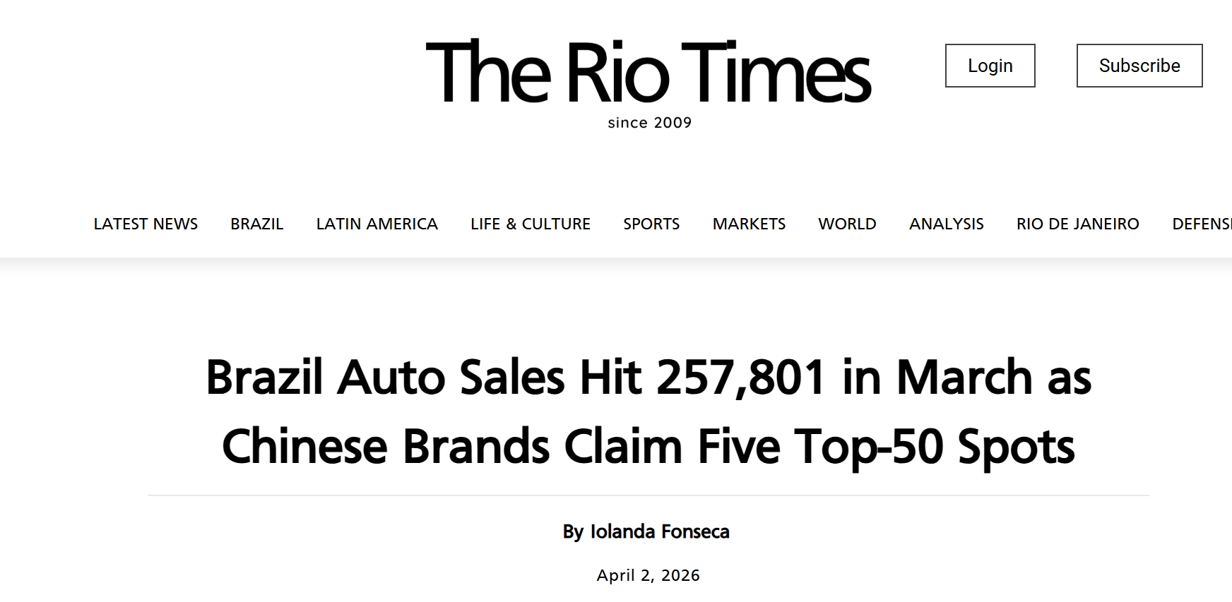 据巴西《里约时报》在4月2日的报道称,已经跻身全球第六大汽车市场的巴西,中国汽车占比越来越高。