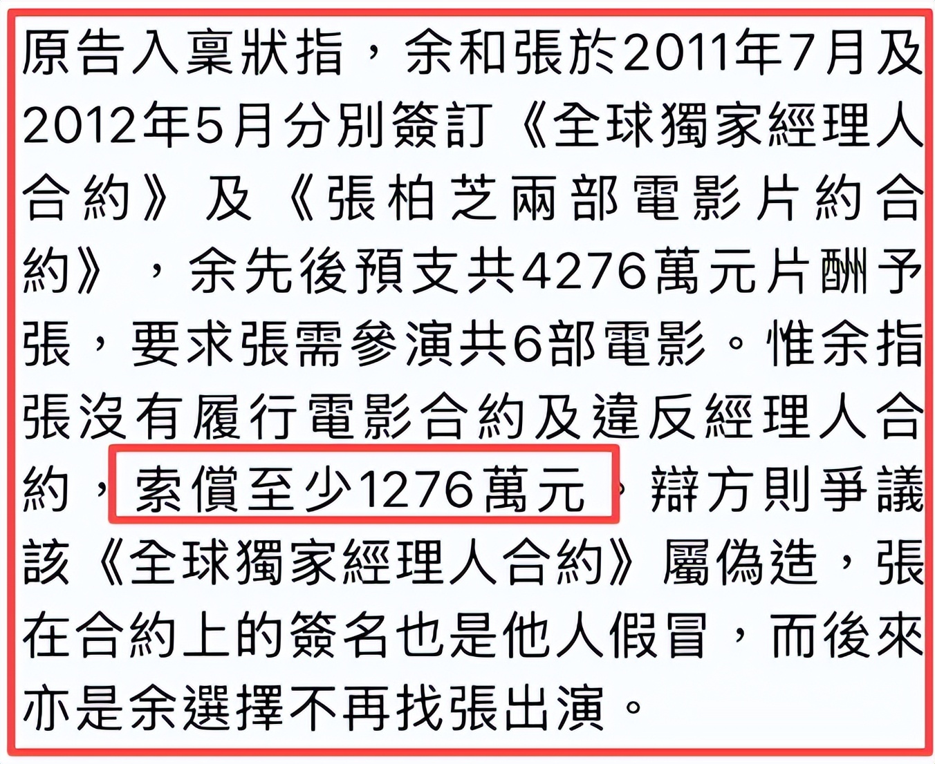 张柏芝还当庭爆料,【余毓兴和她合作时,收1500万片酬,却和她说是700万,曾数次伪造假合同】。
