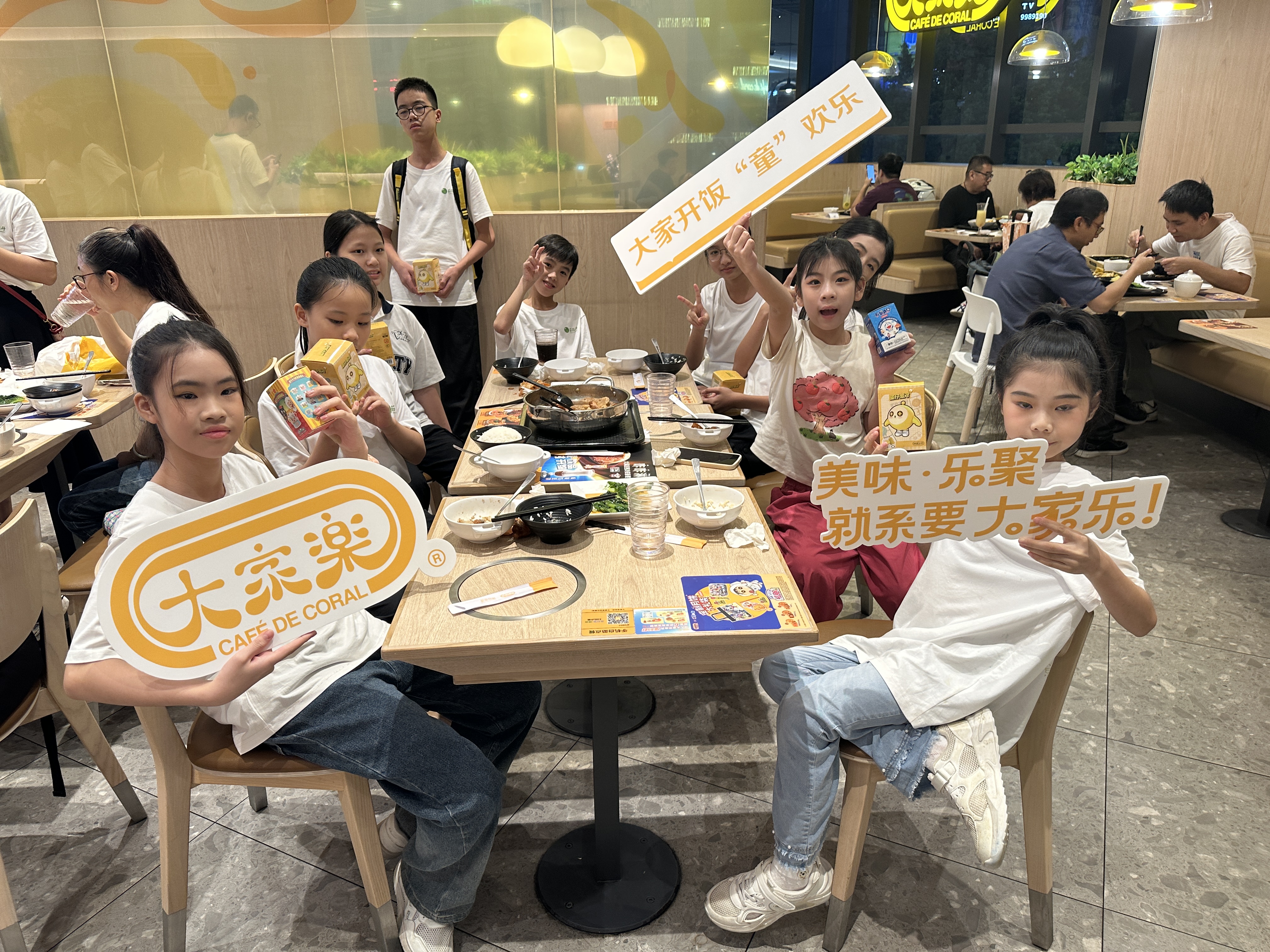 8月23日晚,在大家乐广州合生广场店内,数十名来自广东省内多个县市的师生欢聚一堂。他们刚刚参加了第五届乡村儿童美育成果展“歌声起 苔花开”乡村儿童音乐汇,依然沉浸在兴奋的情绪中,一边享用着热气腾腾的大家乐盆菜,一边分享着这几日参加活动的点点滴滴,店内洋溢着欢声笑语。
