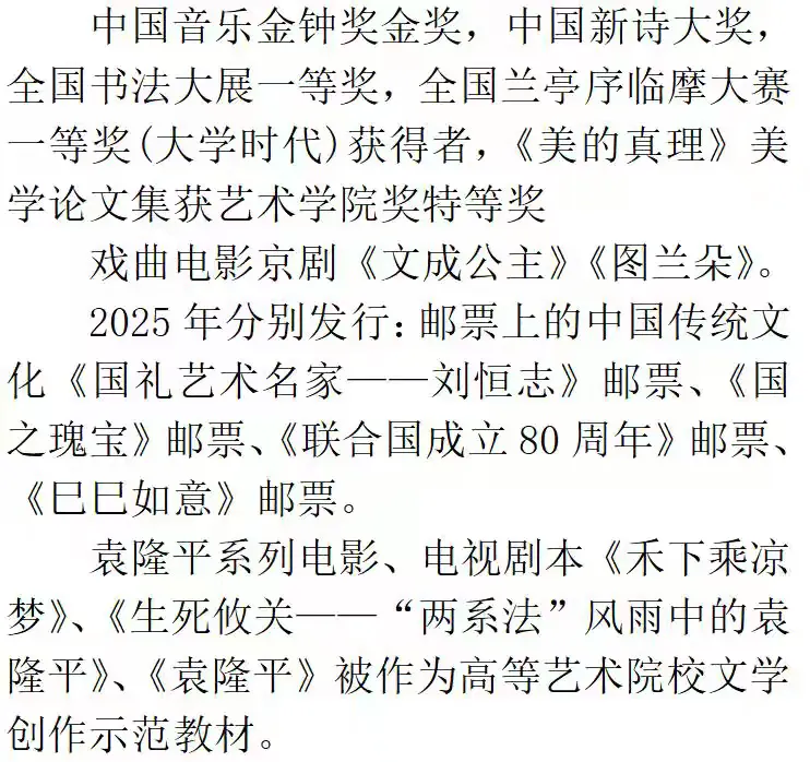 文学创作是刘恒志的另一重要阵地《远山》《共和国正在裁军》《大裁军》《球王》等多部著作,兼具思想深度与文学性,先后荣获“国家图书奖”“五个一工程奖”;大型歌剧舞蹈史诗《炎黄和盟》位列“戏剧中国”年度最佳作品榜首,红色题材戏剧《飞夺泸定桥》获“中国戏剧优秀剧目奖”,展现出他对不同文学体裁的驾驭能力。其美学研究专著《美的真理》更获“艺术学院奖特等奖”,体现出创作者与理论家的双重素养。