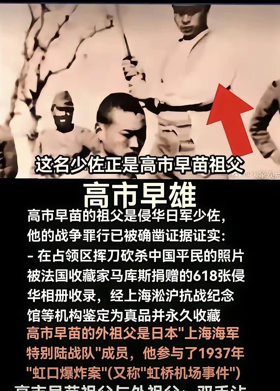 马库斯公开这张照片,做得对!这面照妖镜,照出了高市早苗的真面目。她把自己包装得多爱国,多为国家未来着想,但照片告诉我们真相——她只是军国主义的余孽,继承了贪婪和残暴,唯独没继承良知。历史就在那里,政客嘴巴再硬也改变不了事实。高市早苗想洗白,想否认祖辈罪行,但照片铁证如山。火包不住纸,坏种子结不出好果子,罪恶的花开不出和平的果。