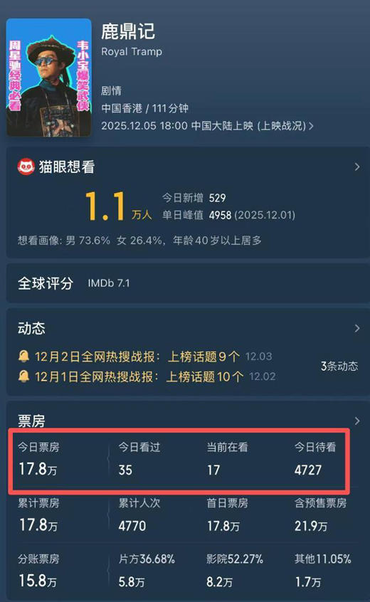 1992年版《鹿鼎记》在香港上映时曾创下4000万票房的佳绩,位列年度票房前三甲。周星驰塑造的韦小宝形象,以其独特的无厘头表演风格和鲜明的人物性格,成为一代人心中的经典记忆。即便到今天,该片在豆瓣仍保持着8.4分的高分评价。去年重映的《食神》还曾创下单日50万的票房佳绩,但这次的《鹿鼎记》却只有不到18万的首日票房,排片占比1.1%的情况下仅贡献了0.2%的票房收入,这样的数据落差令人唏嘘不已。