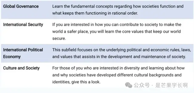 国际关系作为一门学科,并不仅仅关注世界各地发生的事情。我们使用不同的知识视角,即所谓的理论,来研究国家和国家领导人的行为方式的原因。在讨论核扩散、恐怖主义、难民、饥饿和全球变暖等全球性问题时,不存在让所有人都满意的 “正确答案”。重要的是要尊重不同的观点,努力寻找共同点。课堂讨论为具有不同文化背景的学生提供了阐述观点和相互学习的宝贵机会。学到的技能不仅对学生的日常生活非常有用,而且对他们未来的工作场所也非常有用,无论是跨国公司、政府还是国际组织。国际关系专业适合希望作为全球公民为国际社会做出贡献的学生。