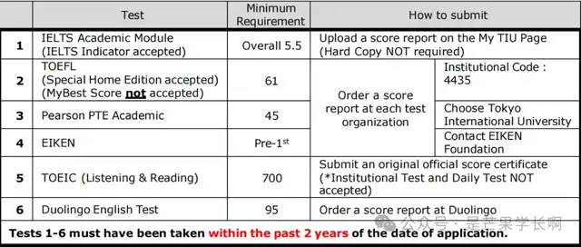 雅思5.5及以上、托福(含家考)61及以上、PTE 45及以上、托业700及以上、多邻国95及以上
