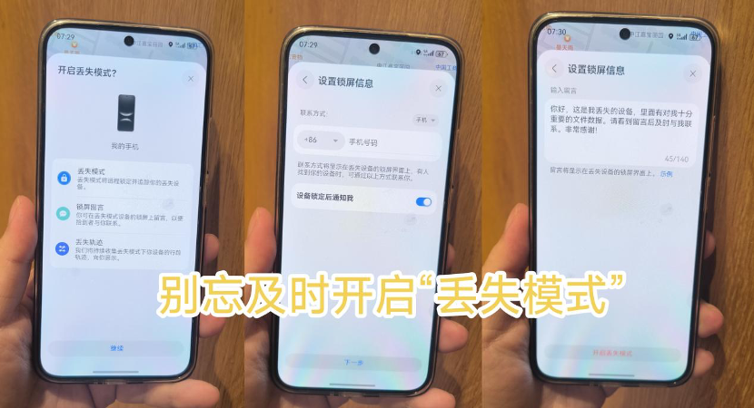 第二招,丢失模式。如果丢的手机距离比较远咋办?不用慌,第一时间开启“丢失模式”,设备直接锁定,锁屏会显示机主的联系信息,还能查看最近24小时的手机移动轨迹。