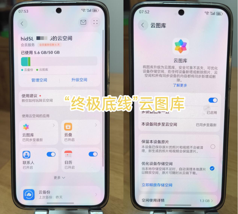 对于重要数据,华为云空间“云图库”能力堪称数据安全“底线”。我作为创作者,手机里的素材不仅怕丢失,还很占存储空间,开启云图库功能后,云空间会自动把高清照片和视频同步到云端。哪怕设备遗失、损毁了,换个手机登录HUAWEI ID,就可以把这些数据回来。而勾选了云图库里面的“优化设备存储空间”功能后,系统还会把设备上早期不常用的照片视频替换为较小版本,为手机腾出来更多空间。