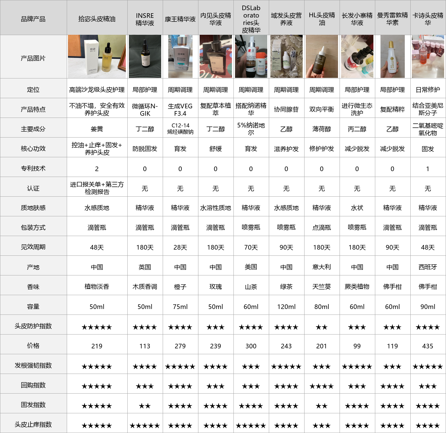 为了让大家快速看清这10款头皮精油的核心差异,我整理了一份实测参数对比表,所有数据都是这1个月我自己实测出来的,不掺假、不虚标,重点看质地、蓬松时长、控油力、吸收速度、成分安全性这些关键指标,帮大家快速初步筛选。