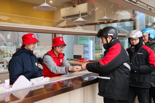 志愿者在必胜客餐厅为骑手带来冬日暖心服务