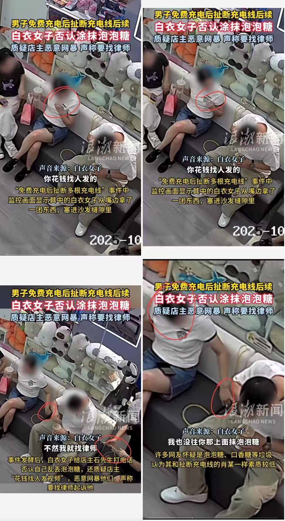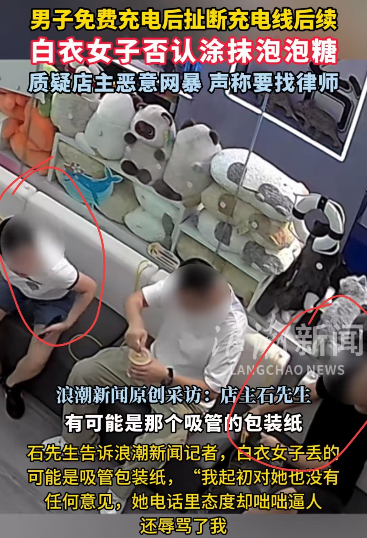 打电话给店家道歉的时候白衣女还矢口否认,说自己没有粘泡泡糖在沙发上,店家也明确解释,没有说她粘泡泡糖在沙发上,可能是吸管纸。