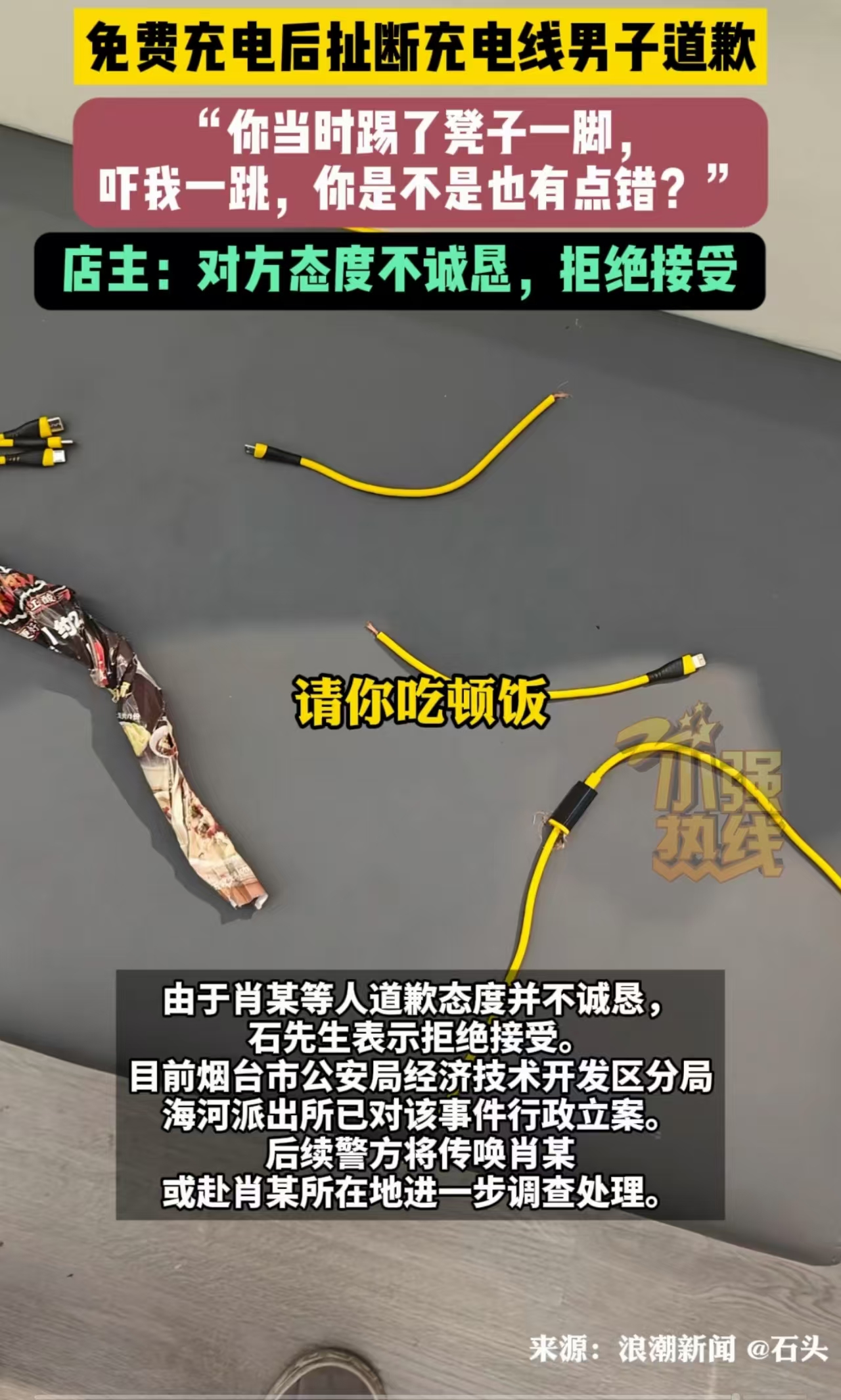 山东烟台,店主留给游客充电用的数据线被黑衣男扯断,损失不大,但影响极坏
