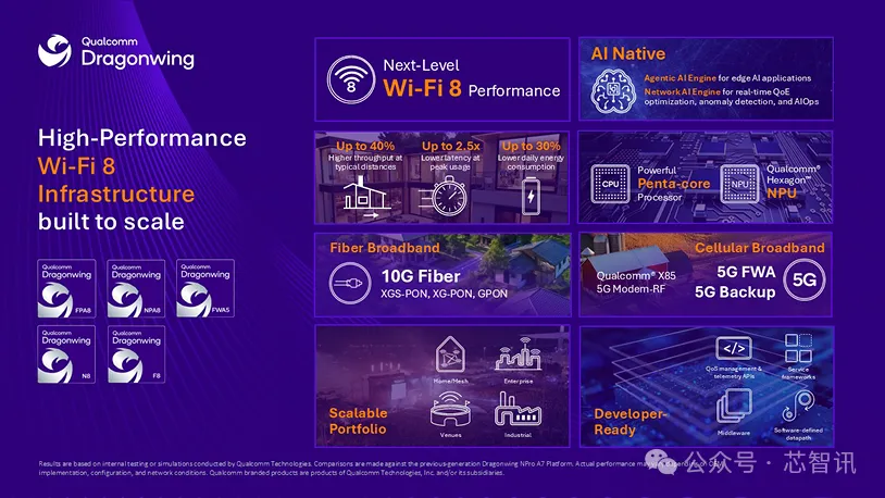 高通科技的Wi-Fi 8龙翼网络平台建立了一类新型网络基础设施,将路由器、宽带网关和企业接入点提升为AI原生系统,具备智能高性能无线网络。该作品集包括: