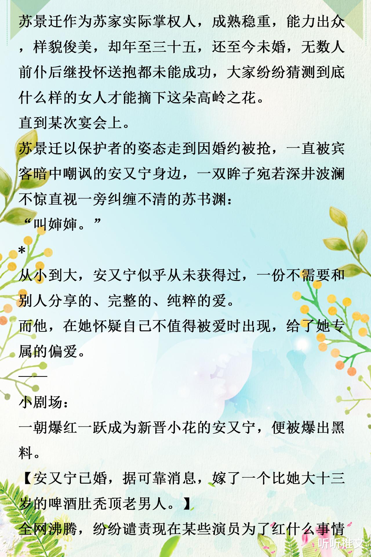 书评:安又宁出身名门,最让人羡慕的是她与苏家小少爷心照不宣的婚约,然而安又宁知道,在继母的算计下,苏书渊早已和继妹暗度陈仓。这让安又宁十分恶心,机缘巧合下,她遇到了苏家掌权人苏景迁,而苏景迁给了她纯粹又完整的偏爱,两人逐渐相知相爱,最后终成眷属。故事基调轻松甜宠,情节紧凑丰富,设定俗中带新,女主摆脱并狠狠打脸渣男获得真爱,男女主感情线循序渐进,两人相处一路撒糖不断,在男主的治愈下,女主也逐渐走出阴霾,整篇故事读起来让人眼前一亮,轻松一读。