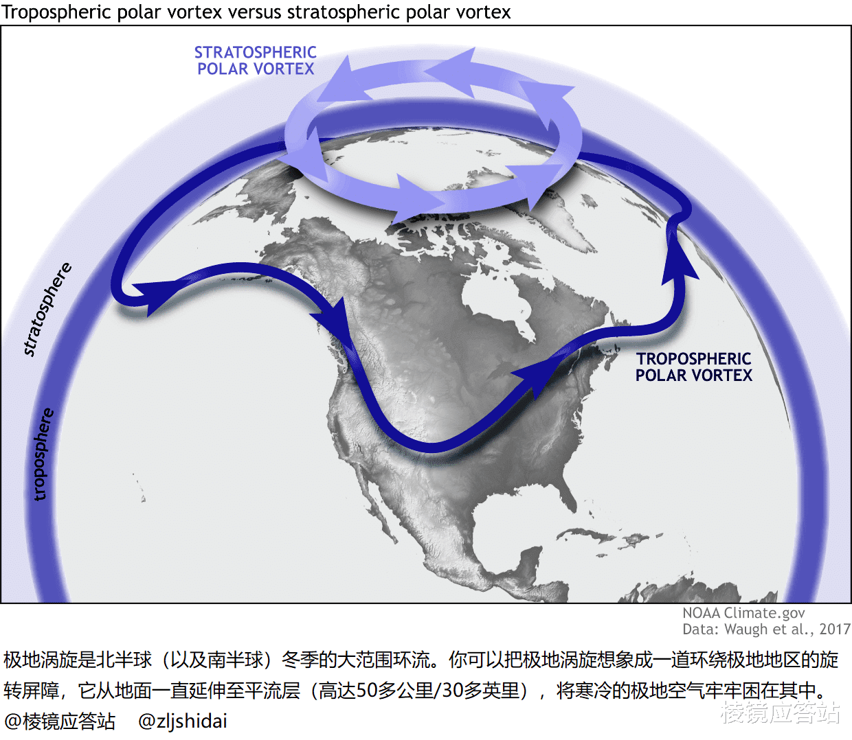 现在,这个通常把北极寒流紧紧锁在极地的高空风带极地涡旋,就好像一个失去平衡的陀螺似的,正把数百万平方公里的极地冷空气往北美和欧洲那边倒。