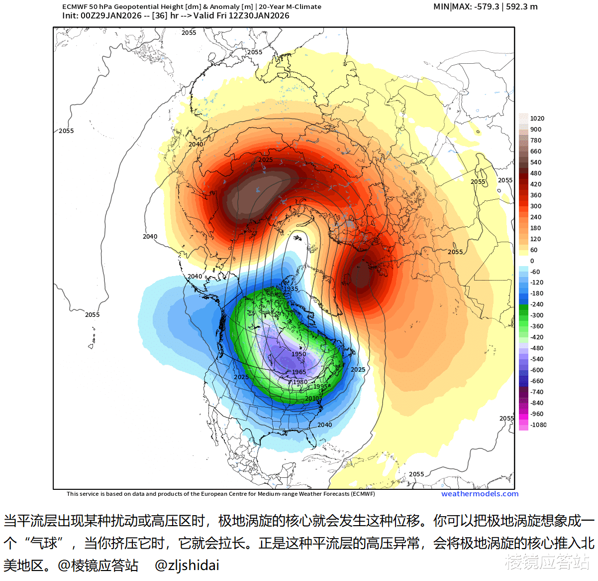 当强大的高压系统往上延伸到平流层的时候,就会像个楔子似的把极地涡旋从北极顶部推开,