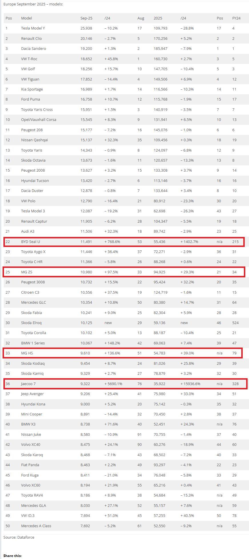 销量最好的中国车型为比亚迪海豹U,月销量超过万台。MG ZS紧随其后,销量也同样超过万台。