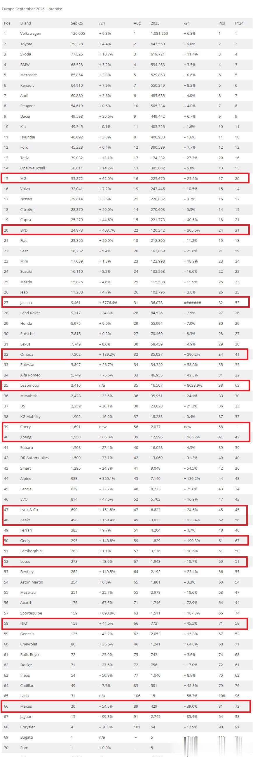 排名第一的中国品牌为上汽名爵,一共销售了33872辆新车,总排名十五。接下来为比亚迪,一共销售了24873辆新车,同比增长了403%,而英国的销量就占了将近一半。最令人惊讶的是奇瑞汽车,杰酷,欧萌达和奇瑞三个子牌合计销量接近2万,成为了最大黑马。零跑和小鹏也有超过千辆的月销量。
