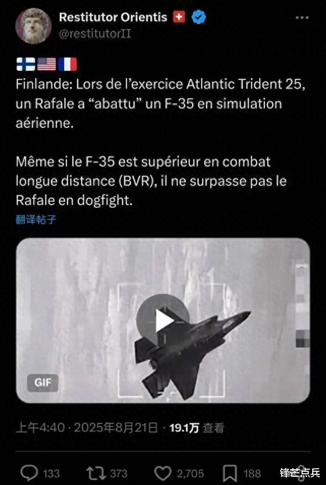 5月份印巴空战,可谓是阵风战斗机自服役以来第一次吃到败仗,一向以阵风战斗机引以为傲的法国达索公司自然是心里憋了一肚子火!前段时间举行的“大西洋三叉戟-25”联合对抗演练中,法国阵风战斗机与美国F-35A战斗机过招,这次对抗演练的结果却是:阵风战斗机在近距离格斗中成功击败了F-35A战斗机!阵风是歼-10CE的手下败将,却在演练中击败了F-35A,那么是阵风战斗机确实实力强劲,5月份印巴空战只是阵风战斗机失手了,还是美国的F-35A战斗机性能太水呢?