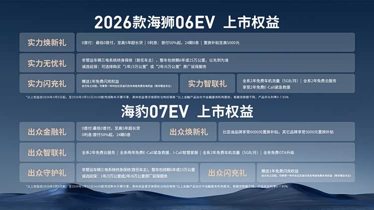 其中,2026款海狮06EV官方指导价为15.99万元-17.99万元,海豹07EV官方指导价为16.99万元-18.99万元,即日起,用户可享包括0首付、0利息、最高18个月免费闪充权益等丰厚的上市权益礼包。
