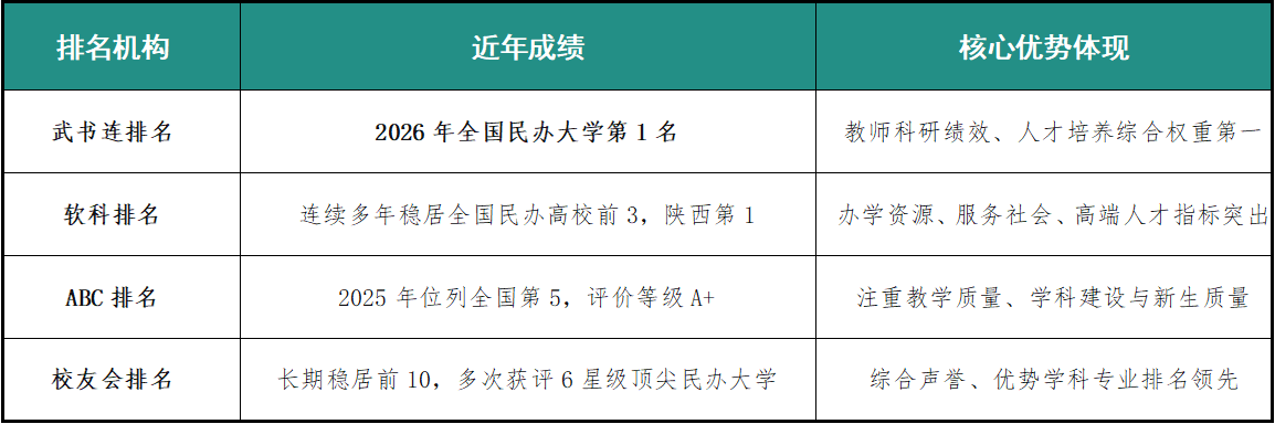 这一历史性突破并非孤立的偶然。当我们把目光投向软科中国大学排名、ABC中国民办大学排名、校友会中国民办大学排名等多维评价体系时,会发现一个清晰的信号:西京学院已不再是传统意义上的“民办追赶者”,而是以硬核数据支撑的“全方位领跑者”。本文将通过四大排名的交叉印证,深度解码这所西部民办高校的“夺冠之路”。