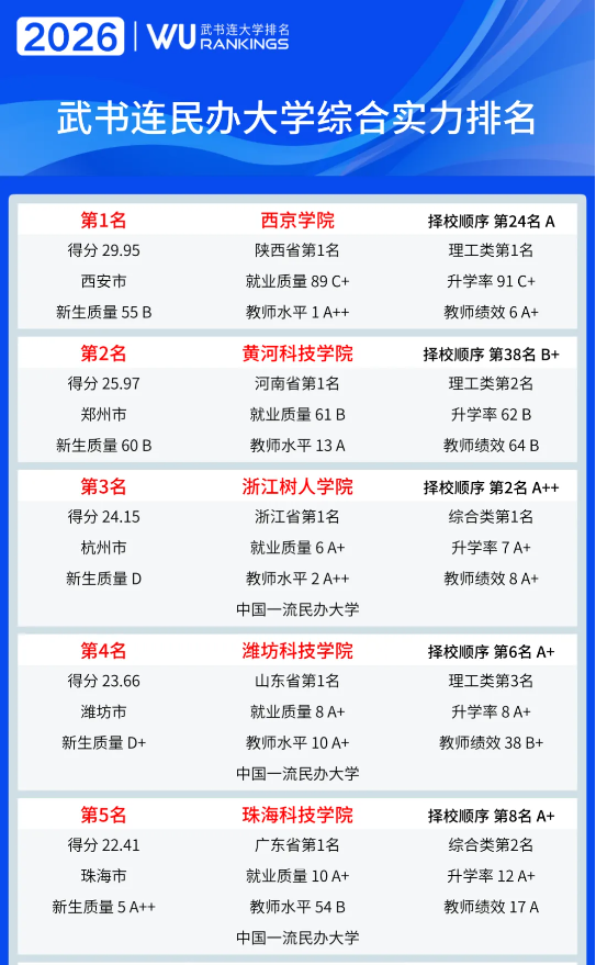 网络参考源:本文数据综合自武书连2026中国民办大学独立学院排名、软科历年中国民办高校排名、ABC中国民办大学排名、校友会中国民办大学排名等公开资料。如需查阅武书连完整排名,可访问其官网或参考《挑大学 选专业:2026高考志愿填报指南(民办大学和独立学院版)》