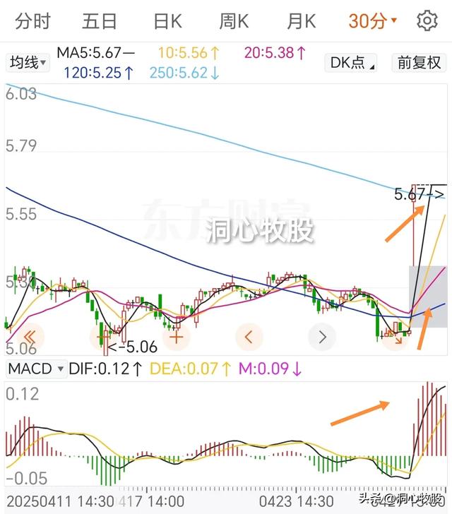 30分钟图中,k线跳空涨停,突破120均线以及前高,但要谨慎追涨,MACD金叉。