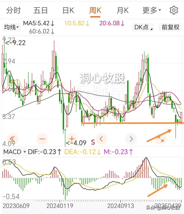 周k线图中,k线超跌反弹,MACD向下趋势放缓。