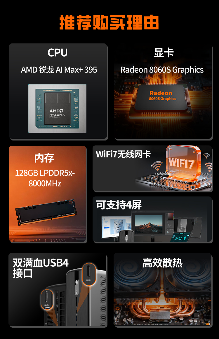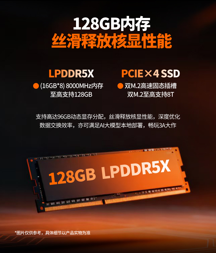 存储扩展方面,其内置了40CU Radeon 8060S集显,显存带宽高达256GB/s,性能表现可媲美RTX 4060独显。还匹配了至高128GB LPDDR5X 8000MHZ四通道高频内存,其中最大可将96GB分配给GPU作为专属显存,丝滑释放核显性能,确保低延时高效率的数据传输,满足大量复杂AI计算的需求,3A游戏大作也可流畅体验。