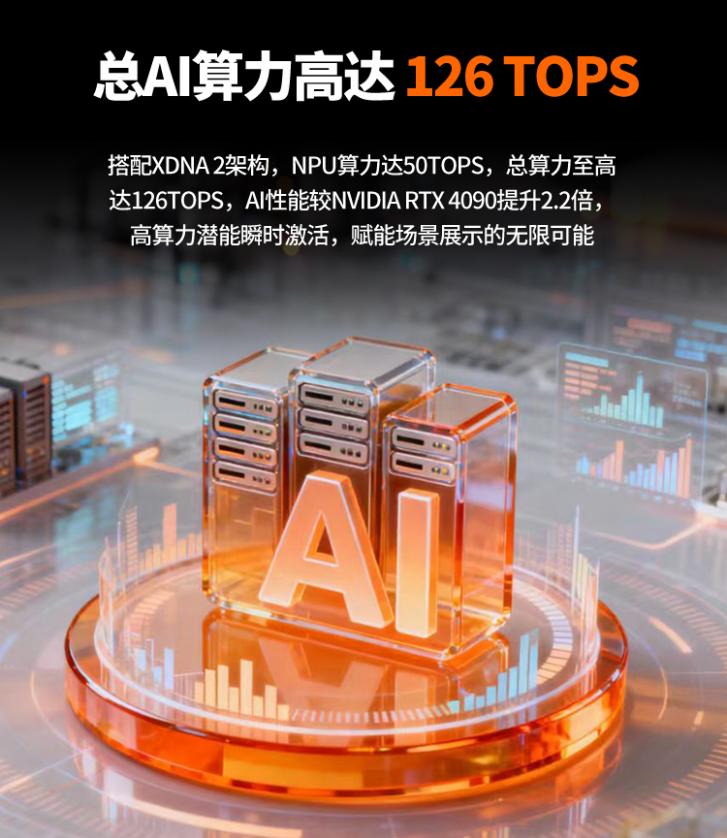 AI性能方面,搭配新一代XDNA 2 NPU架构,AMD锐龙AI Max+395处理器算力达50TOPS,结合CPU+GPU+NPU总AI算力最高可达126TOPS,在LM STUDIO中的AI性能比NVIDIA RTX 4090高出2.2倍,各类端侧AI应用流畅运行,赋能场景展示的无限可能。