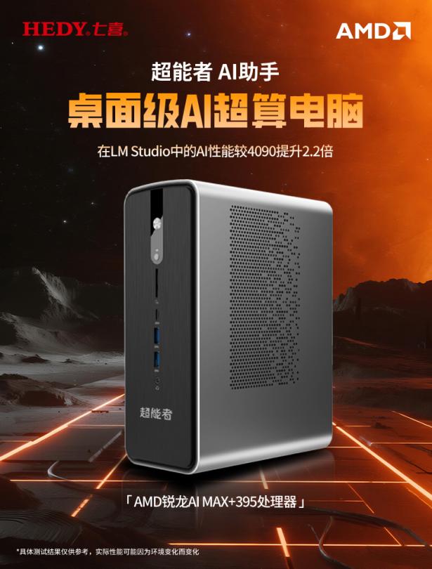 就基本规格而言,七喜超能者AI助手搭载的AMD锐龙AI Max+395处理器,基于4nm制程工艺及“Zen5”架构打造,拥有16核心32线程,单核频率至高可达5.1GHz,为大规模模型本地部署提供了关键支撑。