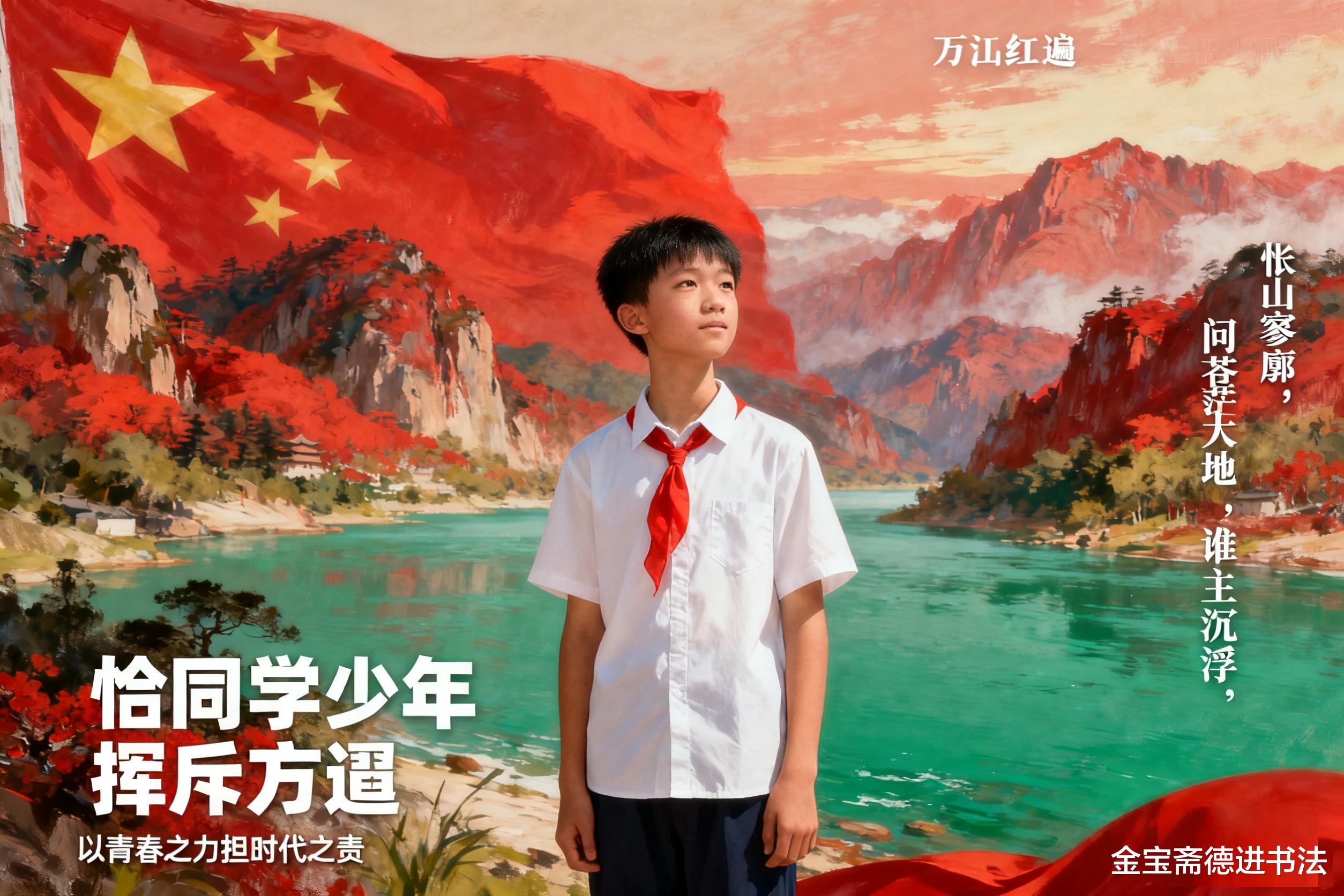 这首词以湘江秋景为引,借 “万山红遍”“漫江碧透” 的壮丽画面,抒发对国家命运的深思与少年担当。“怅寥廓,问苍茫大地,谁主沉浮” 的叩问,藏着对时代变革的敏锐洞察;“恰同学少年”“挥斥方遒” 的描绘,则彰显青春朝气与改造天地的志向。它不仅是对自然美景的赞美,更凝聚着一代人以天下为己任的家国情怀,传递出 “以青春之力担时代之责” 的精神内核。