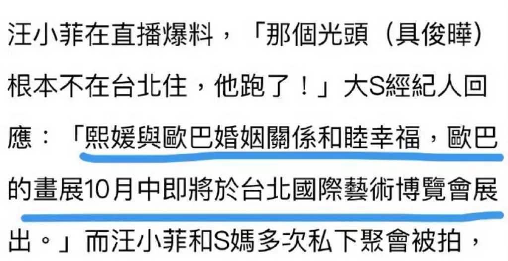 除此之外,汪小菲还成大S身体不好,毕竟是前妻,自己不会不管她,还透露具俊晔已经离开了台北,和大S开始了分居生活。