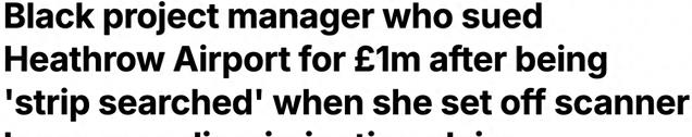 伦敦希思罗机场关于种族歧视的事件曾闹得沸沸扬扬,一位黑人女项目经理维莱塔·布朗,在通过机场安检扫描仪时触发警报,随后被要求进行 “私人搜查”,之后她愤怒地向机场提出超过100万英镑的歧视赔偿。