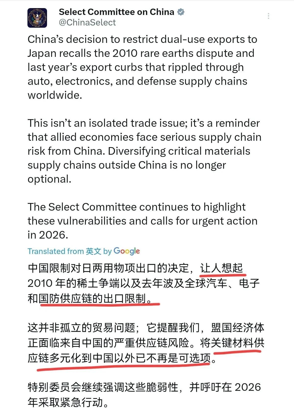 第三件事,美国终于出来表态了!在我们反制日本之后,1月8日,美中战略竞争特别委员会表示中国限制对日两用物项出口的决定,让人联想到2010年的稀土争端,以及去年那场波及汽车、电子和国防供应链的出口限制举措。