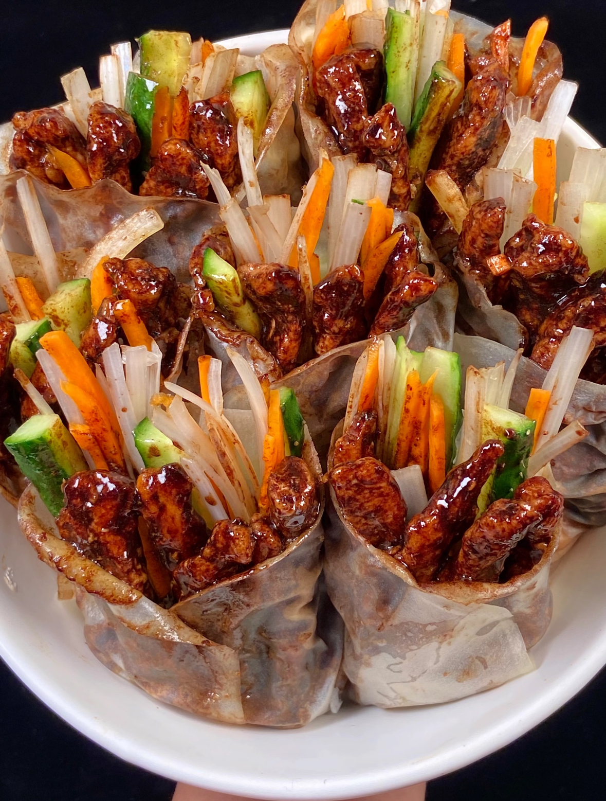 最后的组合,是一场充满仪式感的餐桌艺术。取一张蒸好的薄饼平铺于掌心,夹一筷酱香浓郁的肉丝置于中央,再配上几缕葱白丝、黄瓜丝和胡萝卜丝。提起饼皮一角,轻轻覆盖住馅料,顺势卷起,左右两端向内折拢,便成了一个饱满的“小包袱”。这一卷一折之间,食物的温度透过薄饼传到指尖,各种食材的风味也在封闭的空间里悄然融合。