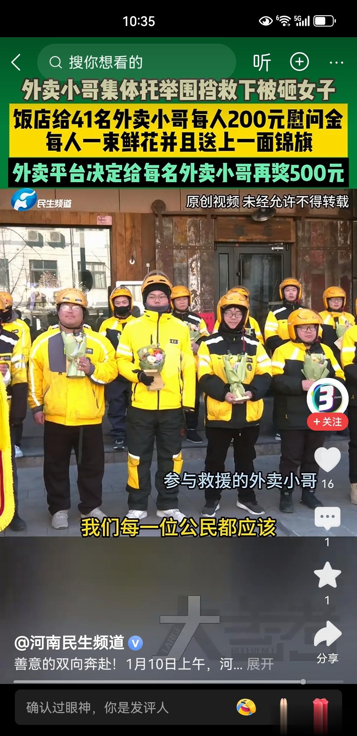 同时平台也表示小哥们是好样的,为表彰此次救援骑手的英勇担当,平台决定授予参与救援的骑手“先锋骑手”荣誉称号,并给每个人发500元奖励。