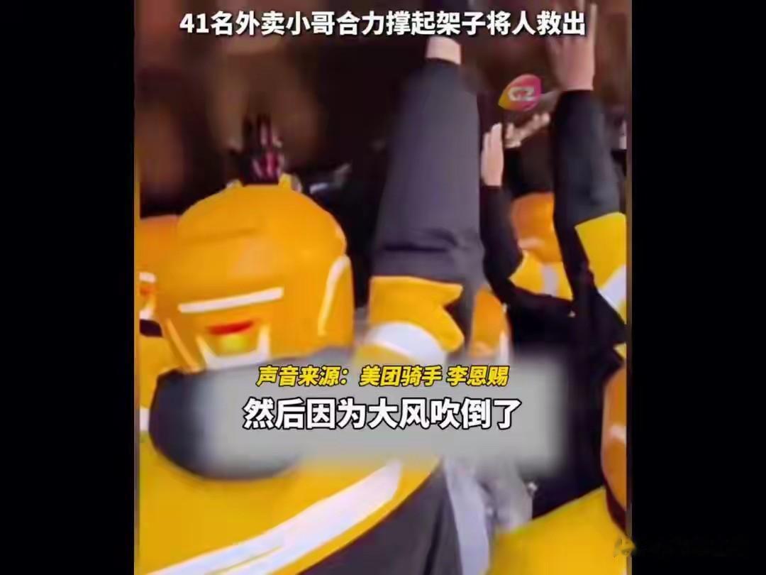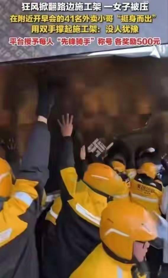 正在附近开早会的41名外卖员出手相救,他们合力将施工架撑起,救出被困女子,随后紧急送医。事后平台决定,给每位外卖员500元奖励。