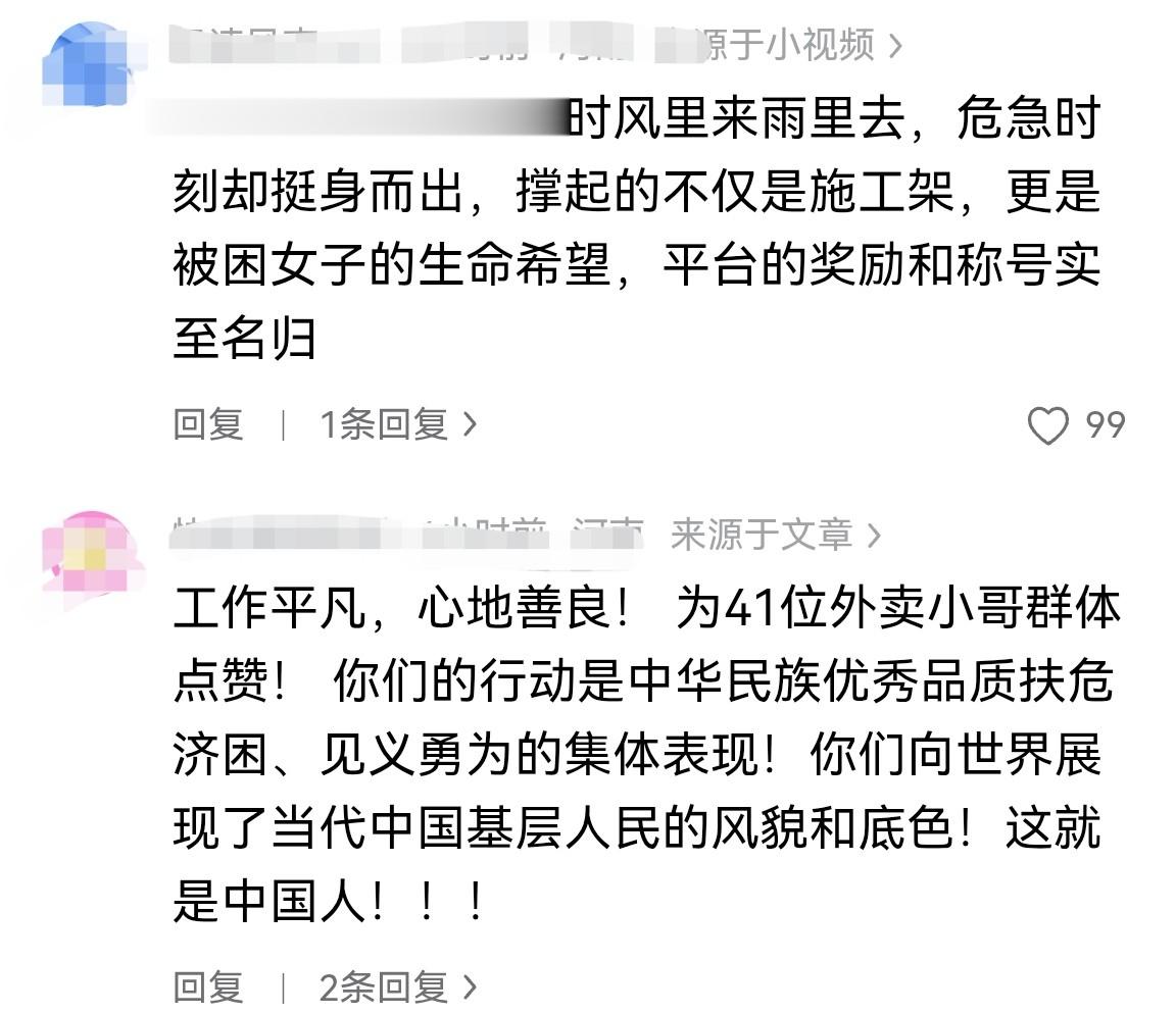 网友纷纷留言赞美小哥太燃了!外卖员平时风里来雨里去,危急时刻挺身而出,撑起的不仅是施工架子,更是被困女子的生命希望,平台的奖励和称号实至名归。