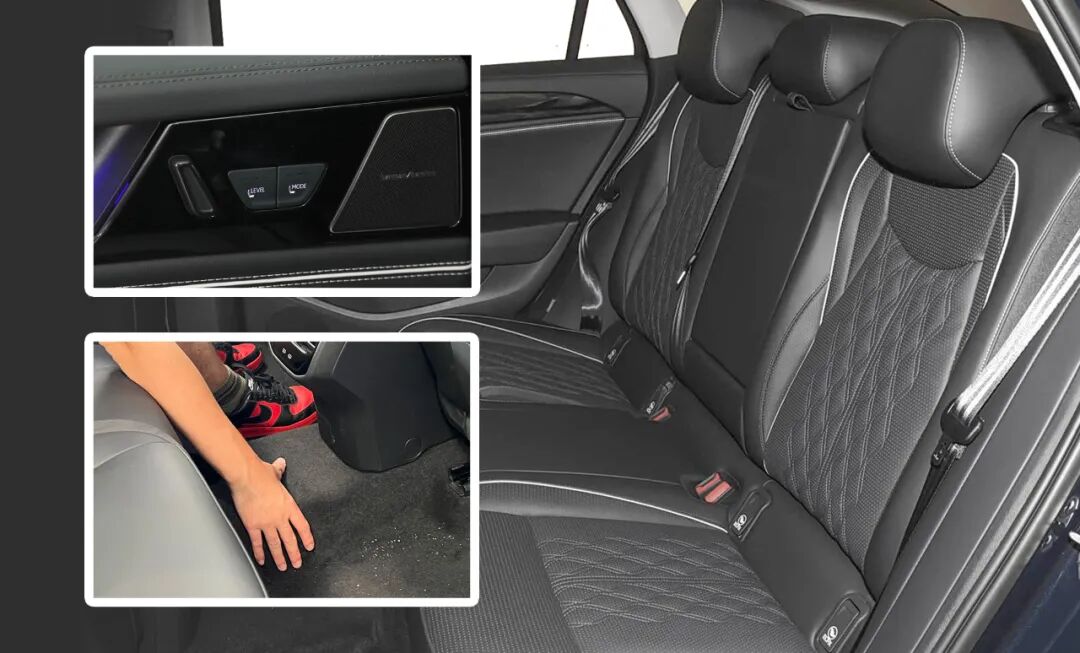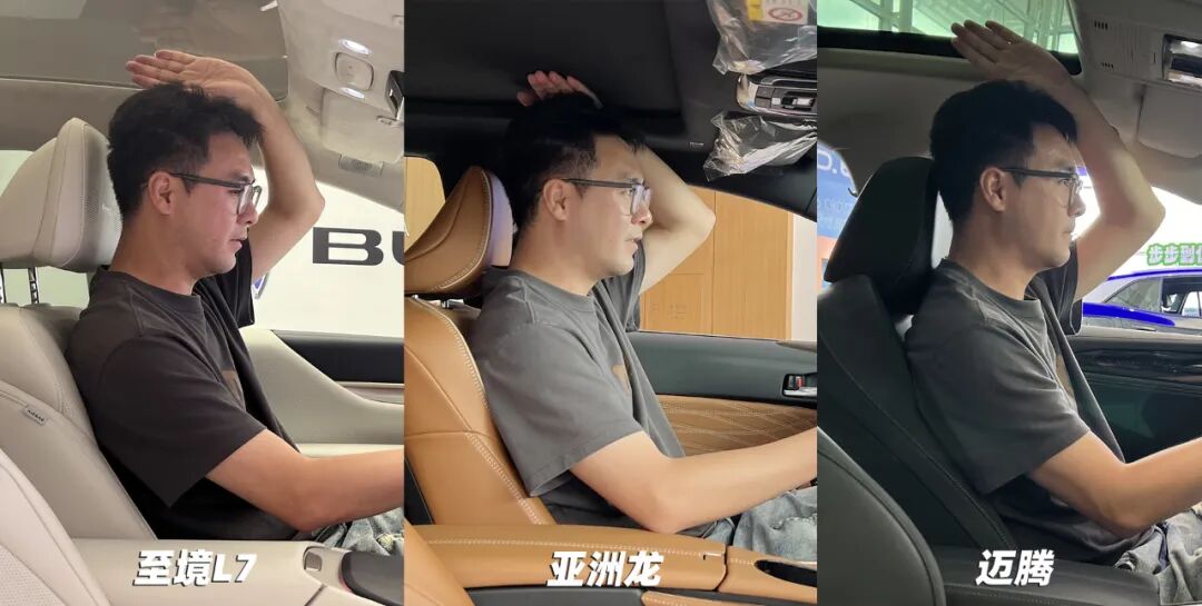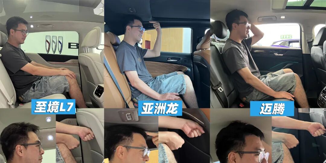 我也实际体验了三款车的空间,别克至境L7无论是腿部还是头部空间表现也都非常不错,要知道这底盘还塞进了电池包,尤其是头部空间的表现。另外,迈腾的腿部空间表现让人惊喜,不过受限地台有较大幅度的隆起,些许影响了乘坐舒适性。